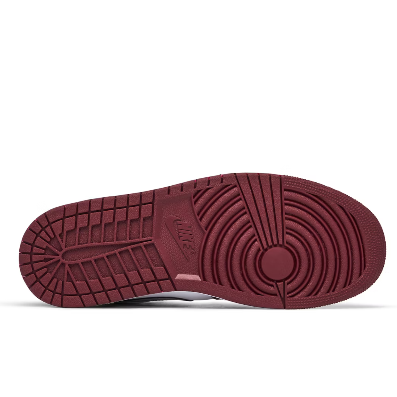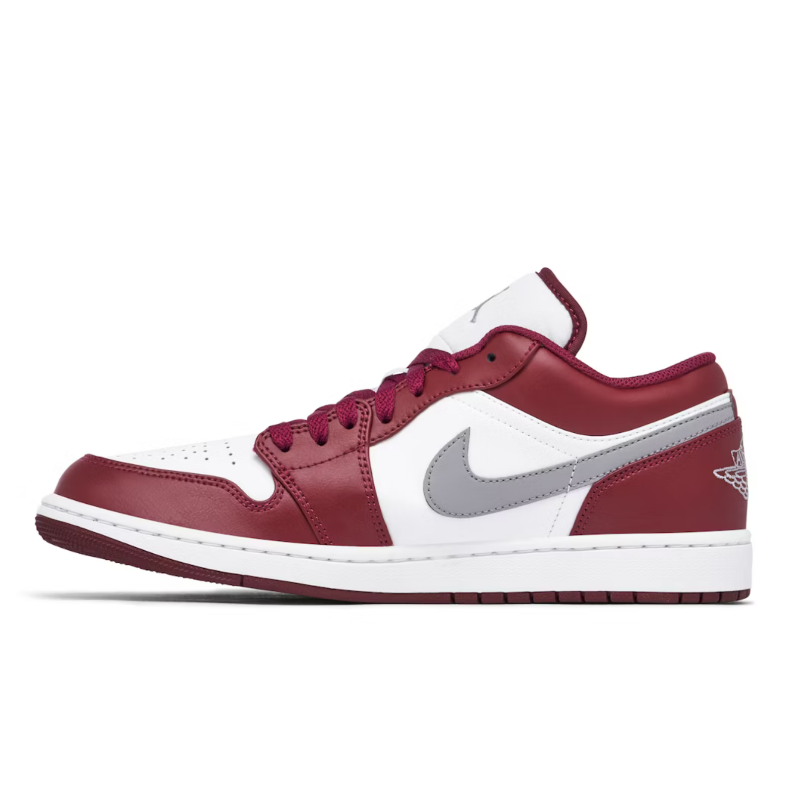 The lining, laces, and outsole of the sneaker are other areas that emphasise the bordeaux colour. The laterals and medials have a grey Swoosh, while the heel features an embroidered “Air Jordan Wings” emblem. A perforated toe box and the Jumpman emblem on the tongue and insole are other characteristics of the Air Jordan 1 Low White Bordeaux. For grip, the rubber outsole sports a linear design.