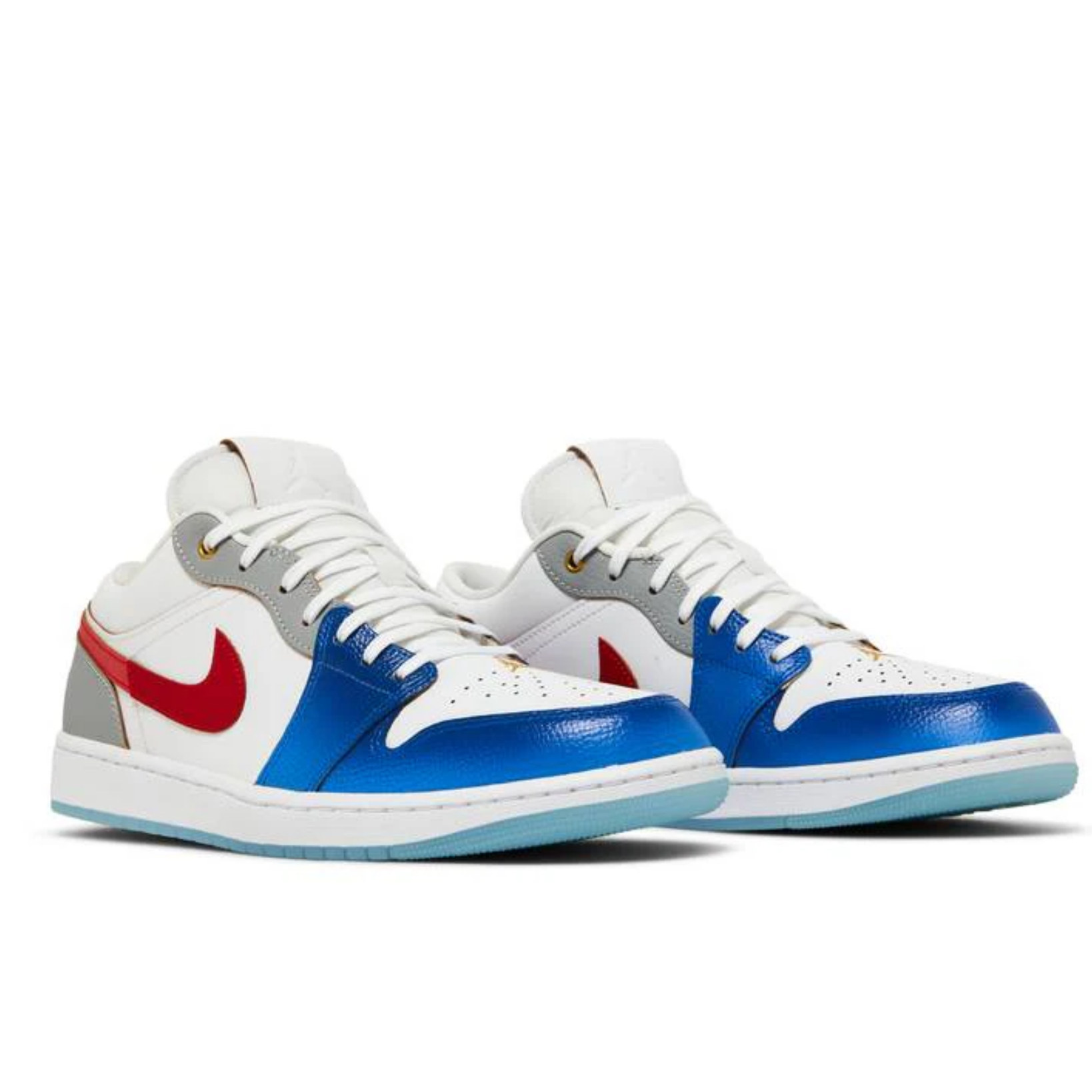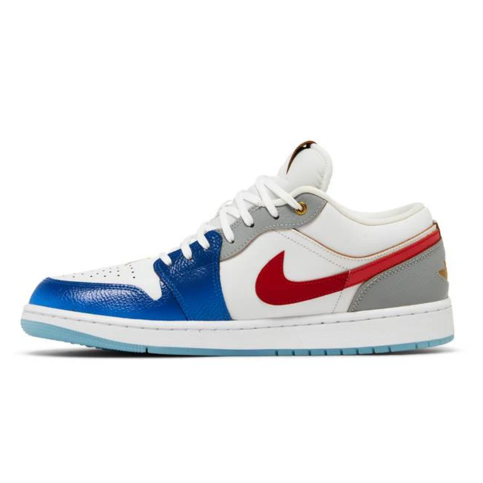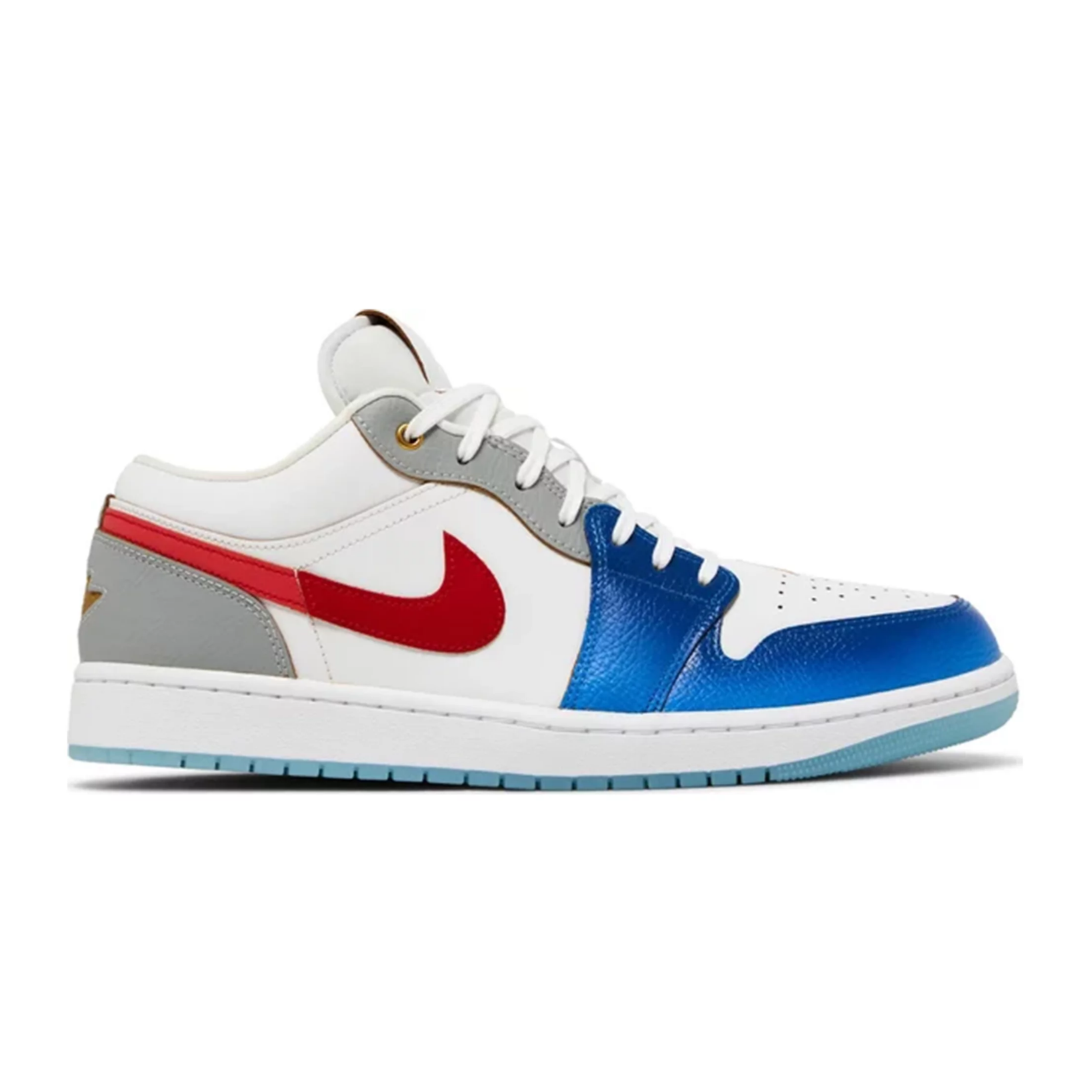 Crafted with a combination of supple leather and textured tumbled materials, this Air Jordan 1 Low showcases a blend of sophistication and sportiness. The inclusion of mesh tongues and inner lining enhances breathability and comfort. The shoe boasts a clean White base, complemented by overlays in Blue and Grey on the forefoot, toe, eyestay, and heels. Eye-catching Metallic Gold accents grace the top eyelets, while the toe box features an embroidered Jumpman logo. The heels proudly display the iconic Wings insignia, and the tongue labels exhibit debossed Jumpman logos on pristine White leather. The insoles bear MJ’s legendary “23” imprint, while a White midsole and translucent icy outsole bring the design together in harmony.