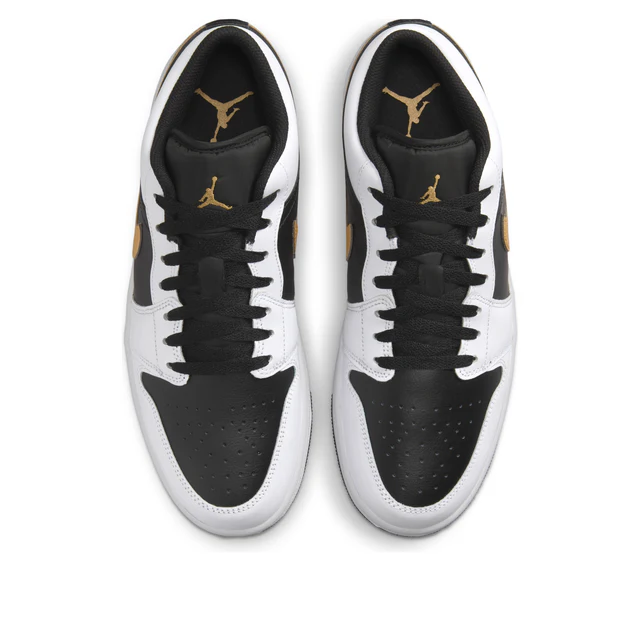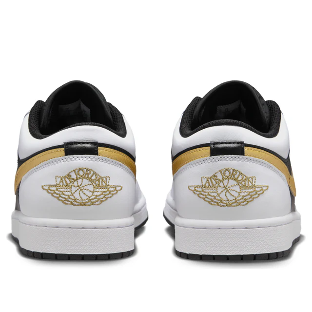 The Jordan 1 Low White Black Metallic Gold Swoosh is a low-top silhouette with a design that is a modified version of the original model, which came out in 1985.