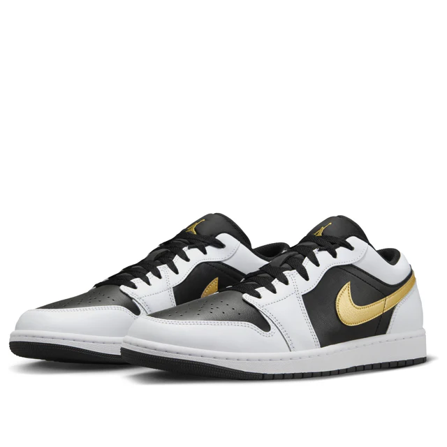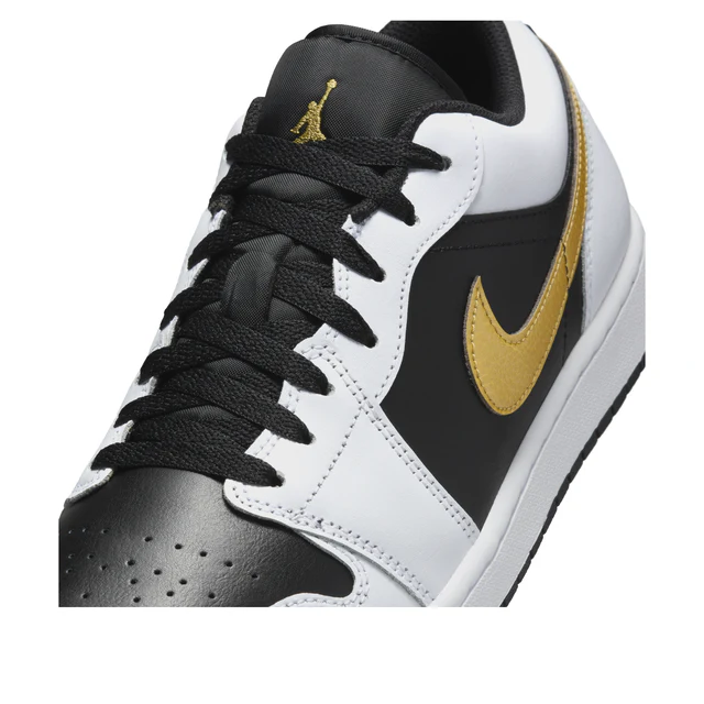 The White Black Metallic Gold Swoosh Jordan 1 Low has a calf leather upper in black and white. Black forms the side panels and the toebox, which is perforated for increased air flow, while white takes over the toecap and mudguard, eyestays, heel counter, and ankle area. As the name suggests, the Nike Swoosh is found in Metallic Gold across both side panels, and a gold Air Jordan logo is embroidered onto the heel counter. A gold Jumpman logo is also found on the black tongue. The rubber midsole is white, and the shoe sits atop a black outsole.