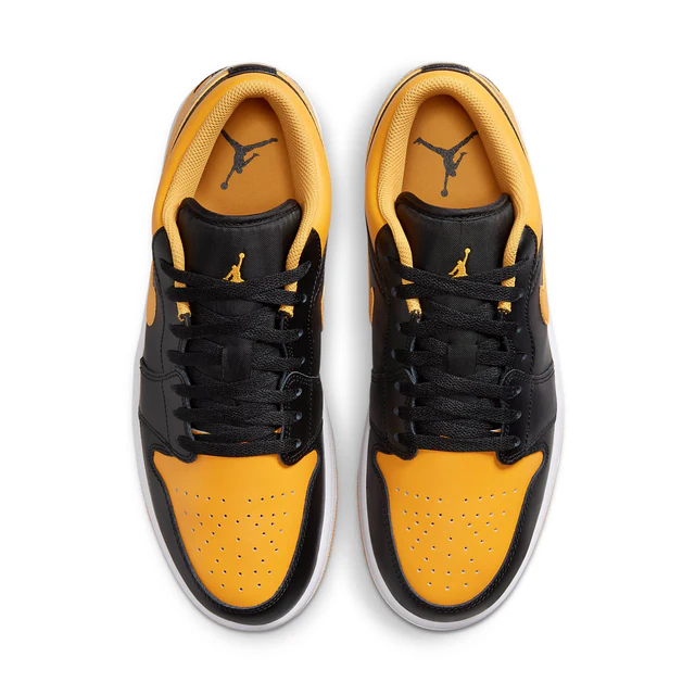 This iteration of the Jordan 1 Low comes with an upper made completely of smooth leather. The midsole is black, while the heel and toebox appear in Yellow Ochre. The toebox is also perforated to allow for better air flow. The Nike Swoosh also appears in Yellow Ochre on the midsoles, and the Air Jordan logo is stamped onto the yellow heel in black. The black cushioned tongue also contains a Simple Yellow Jumpman logo. A white and yellow outsole patterned for traction completes the look.