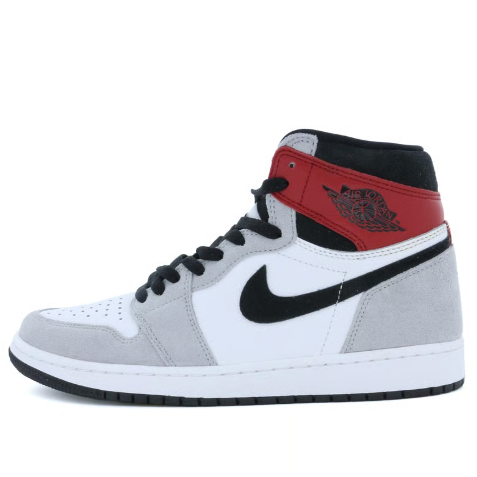 The Jordan 1 High Light Smoke Grey is composed of a white leather upper with grey suede overlays and a red leather ankle panel. Black suede on the heel paneling and Swoosh, a white midsole, and black outsole completes the design.