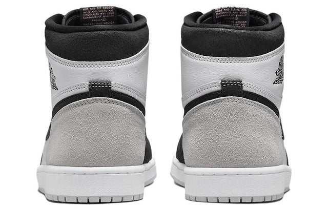 The Air Jordan 1 High OG Stage Haze keeps with the traditional Black Toe aesthetic and has a smooth white leather upper with black overlays and light grey Durabuck heel covers. Jordan Wings Logos on the collars and traditional Nike woven tongue labels give the Air Jordan 1 High OG Stage Haze a vintage vibe. The design is then finished with an Air sole in white and light grey.