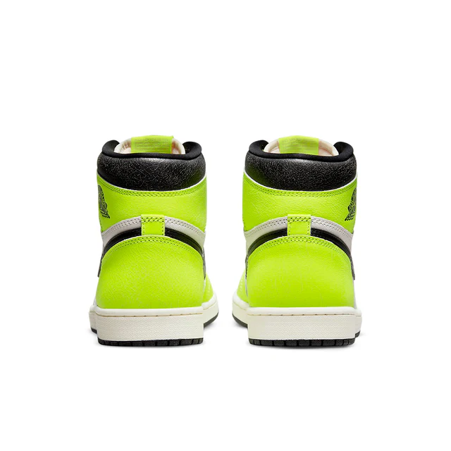 The Air Jordan 1 High Visionaire features a smooth white leather upper with black leather collars, neon yellow overlays, and black Swooshes. A classic Jordan Wings logo at the collar and Nike woven tongue labels nod to the OG 1985 design. From there, an off-white and black Air sole adds the finishing touch.