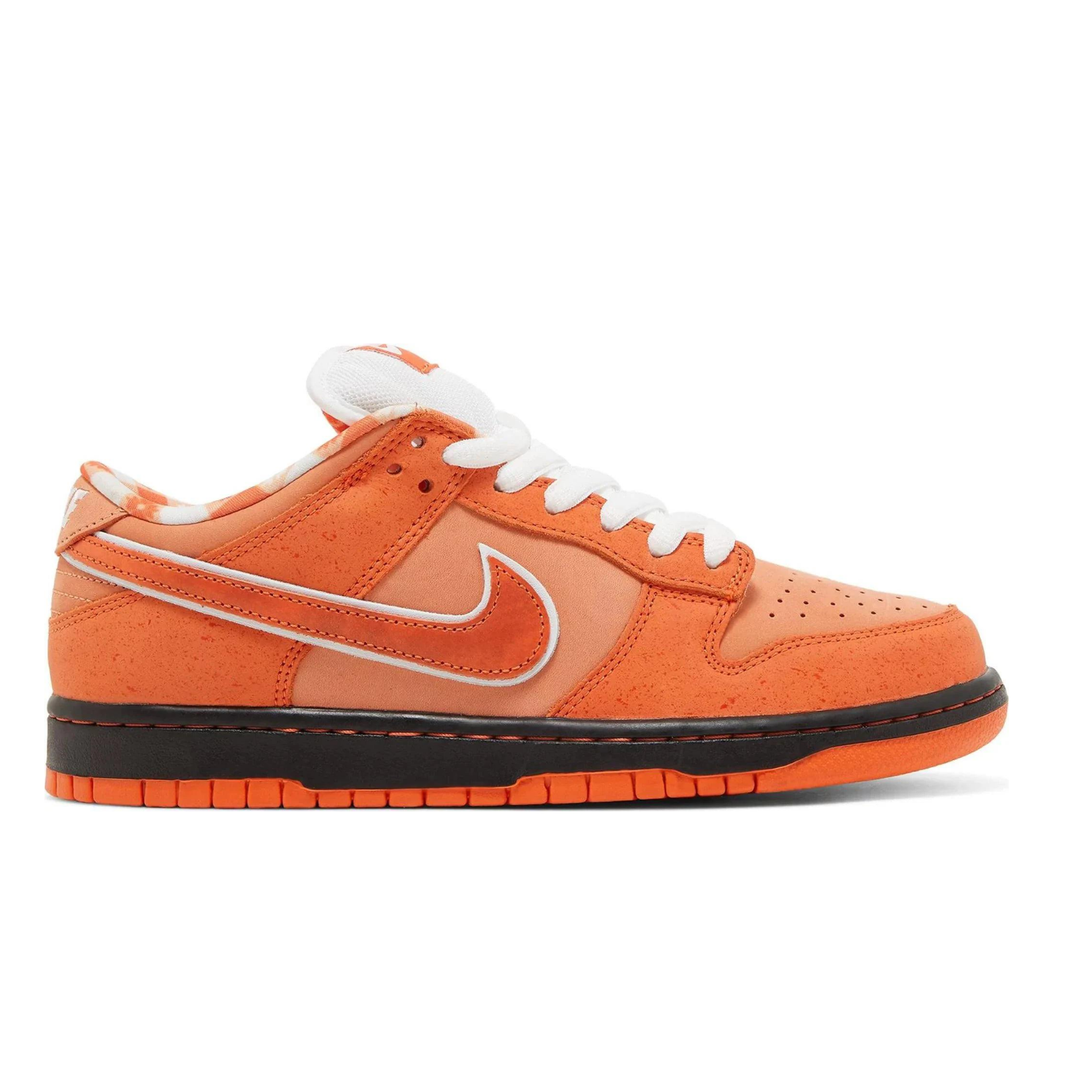 The shoe’s inner lining is embellished with a pattern inspired by bibs, and the tongue of the shoe is made of white mesh material and features a woven Nike SB tag, providing a stylish touch. The Nike SB Dunk Low Concepts Orange Lobster also boasts an orange rubber outsole and a cupsole with black sidewalls.