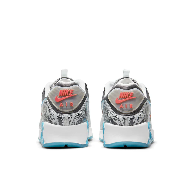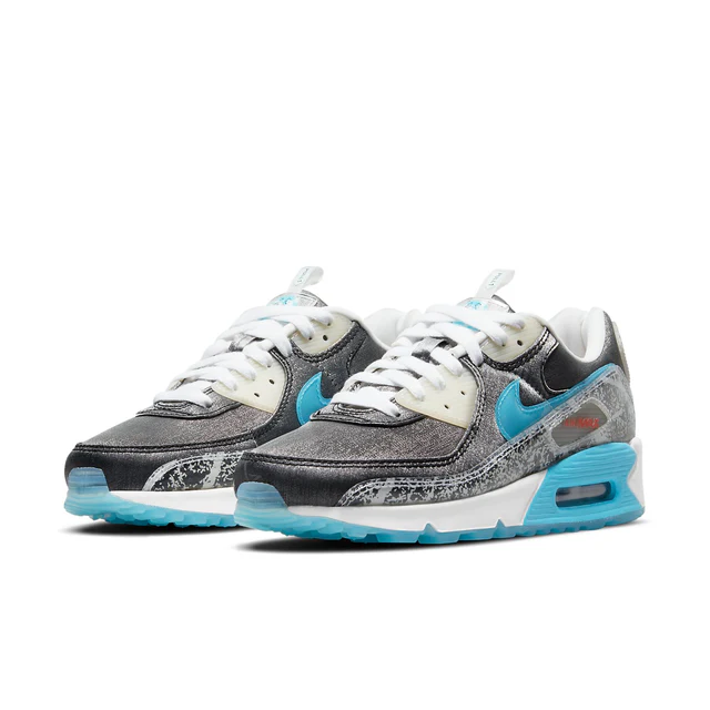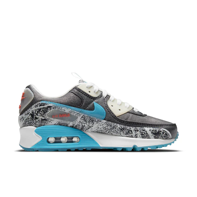 The Air Max 90 has a predominantly gray upper, which is constructed from a combination of leather and synthetic materials. The gray base is complemented by white accents on the laces and collar lining, while the mudguard features a monochromatic print. The midsole is white with light blue detailing around the Air unit, while the outsole is fully light blue.