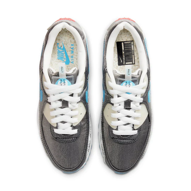 What we love most about the Nike Air Max 90 Rice Ball (Women’s) is the unique color scheme. The gray denim blends seamlessly with the white and light blue accents, while the graphic printed mudguard adds a bit of texture and visual interest to the shoe’s design.