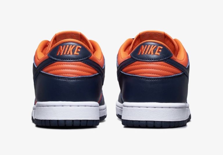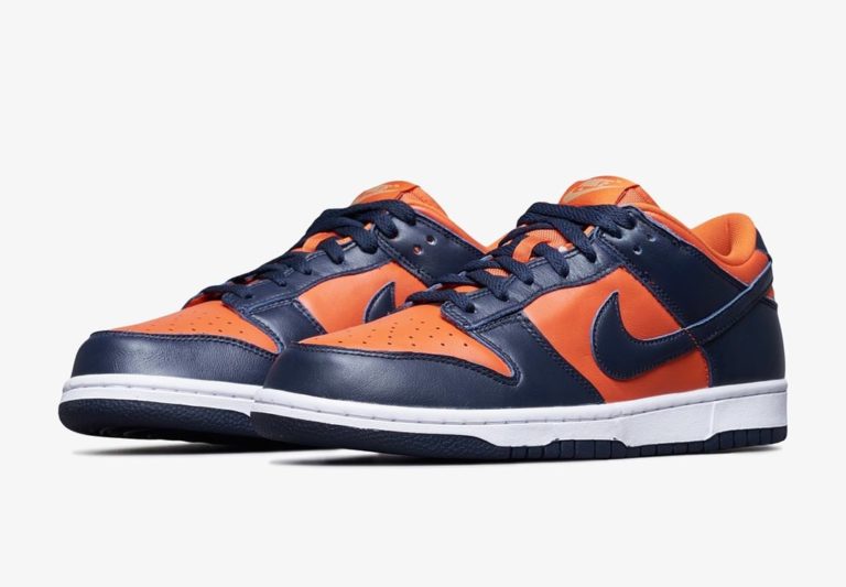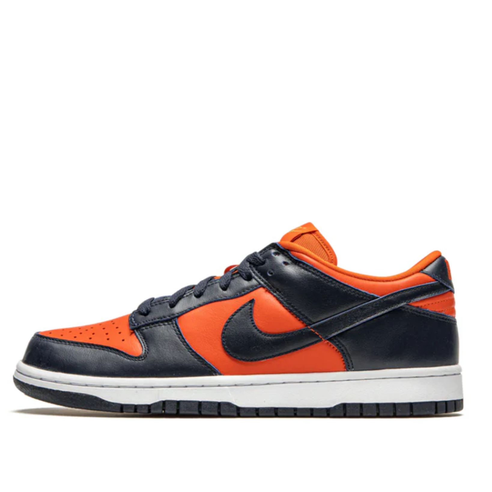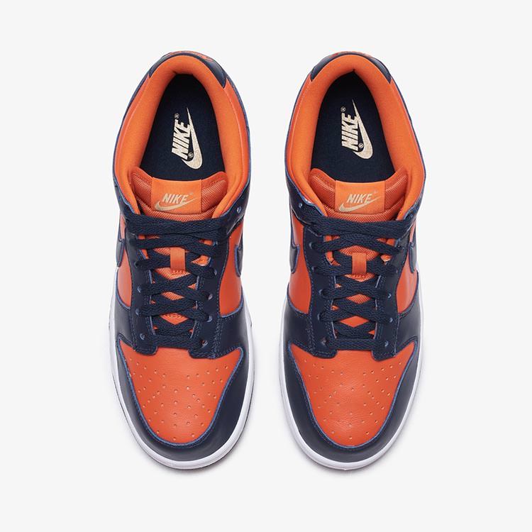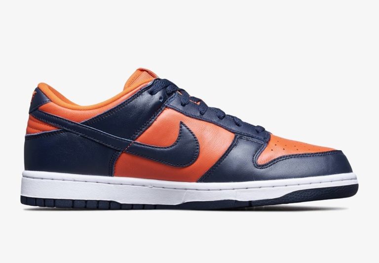 The Nike Dunk Low Champ Colors features a dark navy leather upper with orange overlays and detailing. Yellow Nike branding on the tongue, white midsoles, and navy outsoles complete the design. These Dunk Lows released in June of 2020.