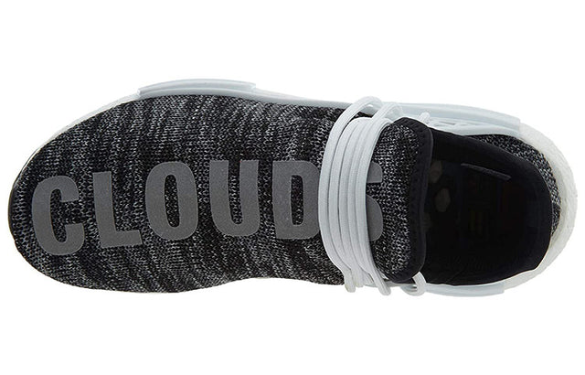 The Primeknit upper of the adidas Human Race NMD Pharrell Oreo features a heathered black and white appearance, while the words “Clouds” and “Moon” etched in metallic silver on the vamp of each shoe.