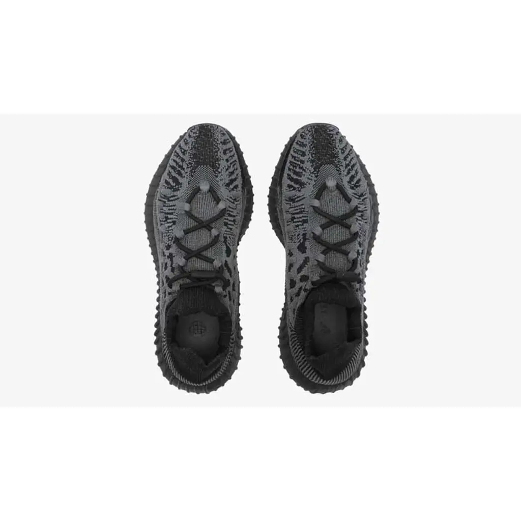 The adidas Yeezy 350 V2 CMPCT Slate Onyx features a PrimeKnit canvas characterized by a combination of black and gray tones, all of which sit atop a black sole equipped with cushioning Boost technology.