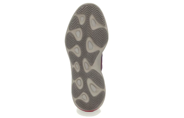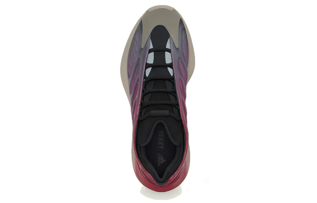 The adidas Yeezy 700 V3 Fade Carbon features a red-to-purple gradient Primeknit upper with semi-translucent TPU lace cage unit and light grey reinforced toe wrap. The gradient theme continues on the EVA foam sole, where red on the heel transitions into a light grey. A black mesh collar and lace system completes the design.
