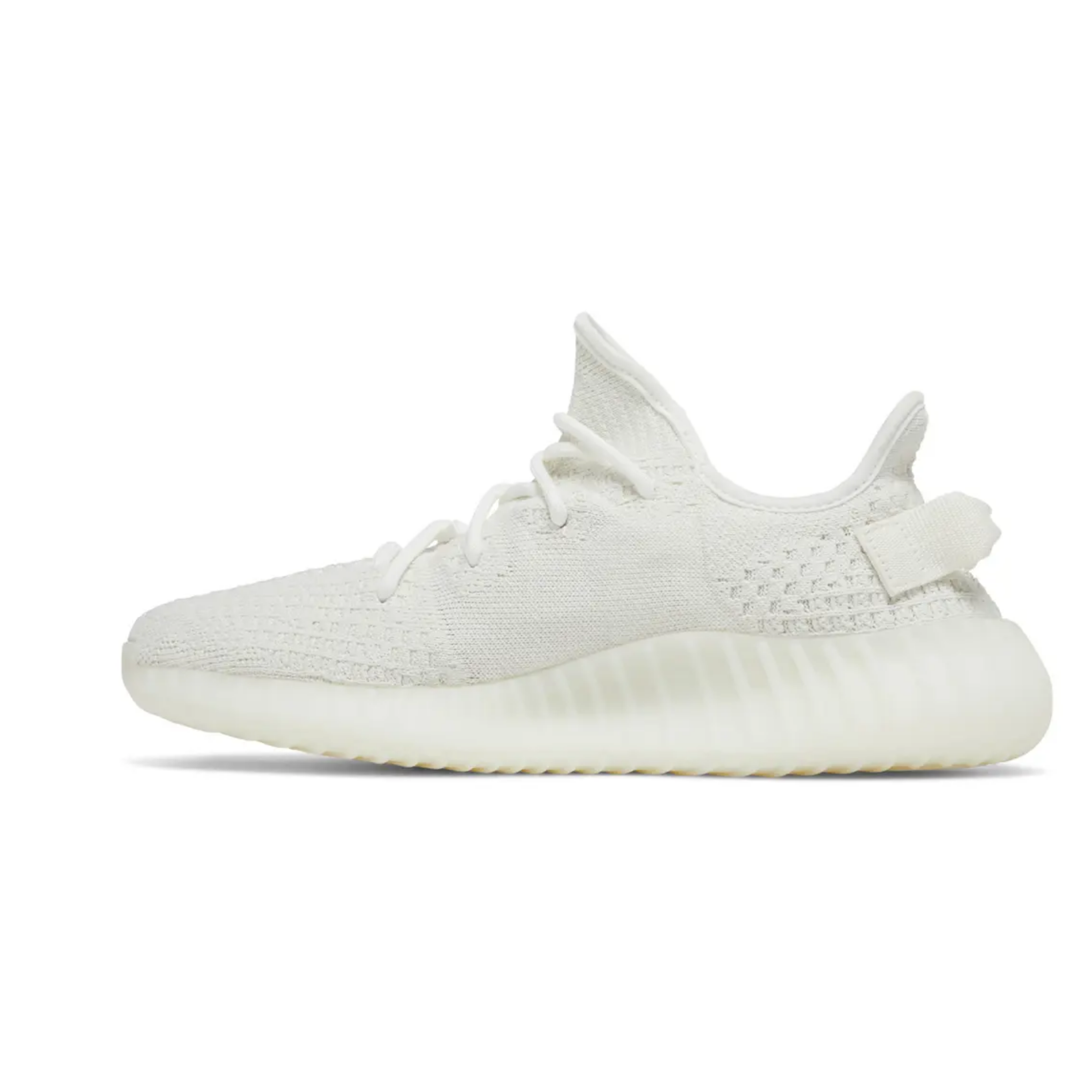 The triple white Primeknit upper of the Adidas Yeezy Boost 350 V2 Bone is accented with mesh side stripes and canvas heel tabs. A semi-translucent sole with Boost technology at the base completes the look of the Adidas Yeezy Boost 350 V2 Bone.
